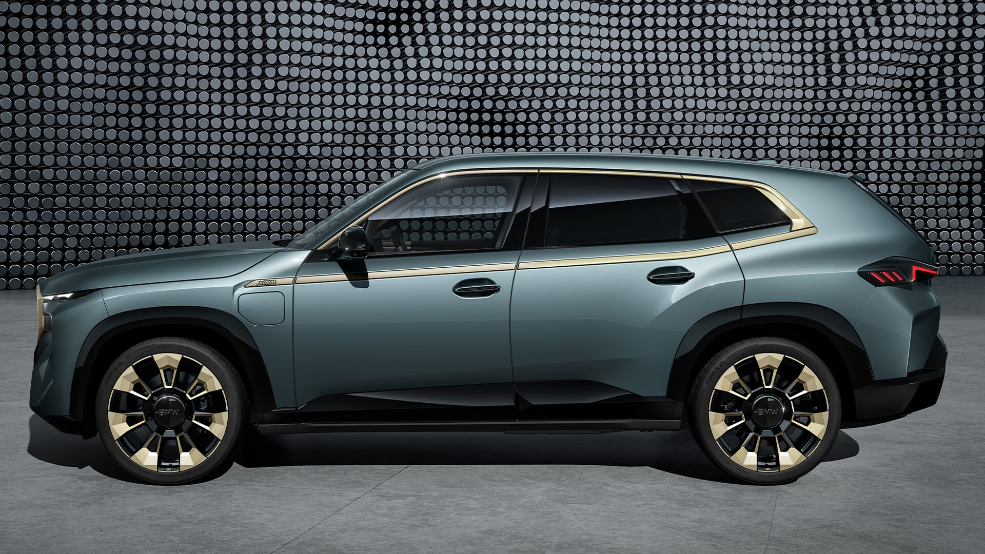 The side view combines the strong character of the design in coupé style with powerful proportions and styling highlights such as the darkest windows of the entire BMW model range. Both the 23” light alloy wheels and the accent band that make the shaping of first-ever BMW XM unique create an especially exclusive effect in the accent colour Night Gold.