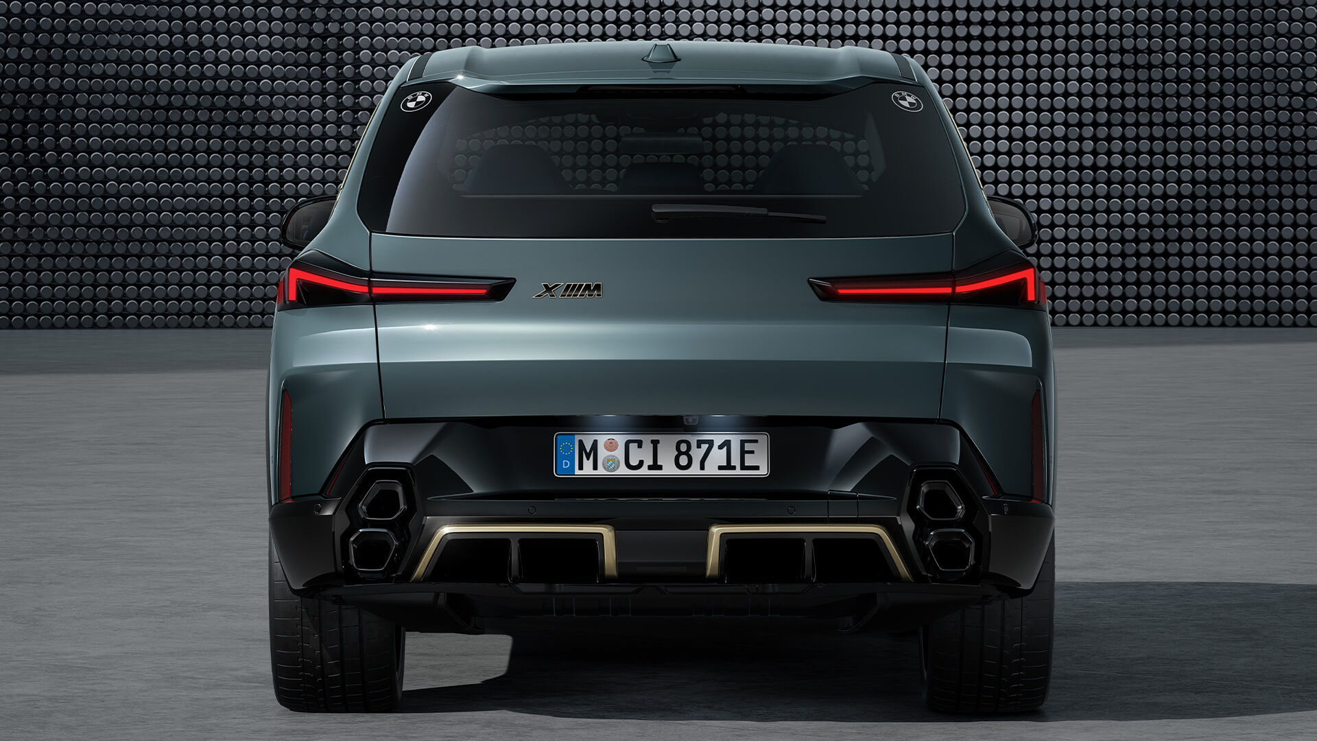 The vertical, hexagonal M twin tailpipes give the rear with gold-coloured diffuser accents and first-ever BMW XM logo a unique presence. The two BMW logos lasered on either side of the rear window make reference to the last “M only” model – the BMW M1. Together with the wheel arches, the surrounding rear lights emphasise the robust, broad stance.