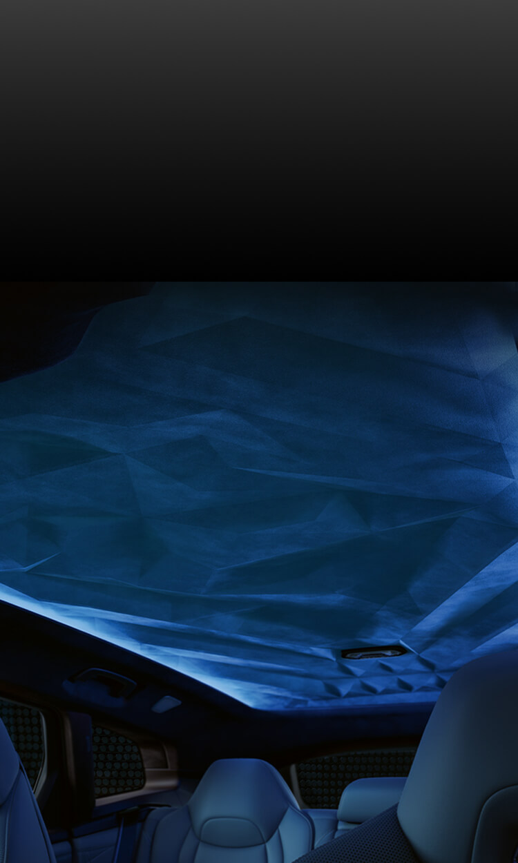 The indirectly illuminated headliner impresses with a three-dimensional prism structure. Distinctive Ambient light provides a splendid presentation of the various lighting designs such as the welcome scenario. The colour selection can be adapted to individual needs to match driving mode and atmosphere.
